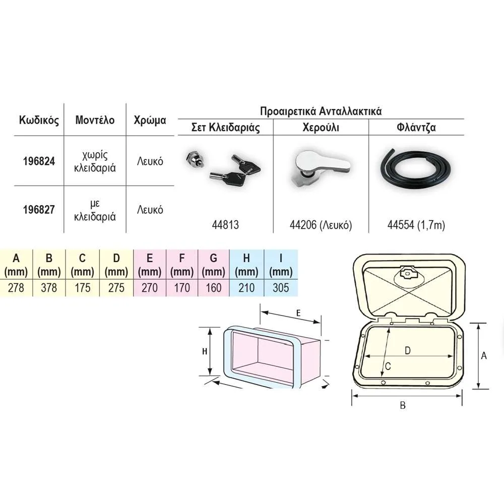Σχεδιασμένες για εξωτερική χρήση, με πόρτα ανοίγματος 180⁰ και ανθεκτική λαβή. Είναι ειδικά σχεδιασμένες με αντιολισθητική επιφάνεια και μπορούν να τοποθετηθούν τόσο οριζόντια όσο και κάθετα. Τοποθετούνται με βίδες που δεν φαίνονται για διακριτική εμφάνιση. Το ελαστικό παρέμβυσμα EPDM παρέχει αντίσταση στο νερό. Αυτό το προϊόν εγγυάται εύκολο άνοιγμα και εύκολη πρόσβαση όταν χρειάζεται. Προσφέρονται με λαβές λευκού χρώματος και μπορούν να παρασχεθούν με επιλογή με κλειδαριά (χωρίς ISO).